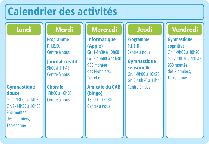 En collaboration avec le CISSSL (Centre intégré de santé et de services sociaux de Lanaudière) Le programme PIED vise à prévenir les chutes et à améliorer la qualité de vie des personnes de 65 ans et plus. Offert gratuitement, il comprend des séances d’exercices en groupe, des informations utiles, et des exercices à faire chez soi, adaptés aux capacités des aînés. Ce programme nécessite un engagement pendant 12 semaines avec des scéances 2 fois par semaine. Inscriptions sur liste d’attente. |